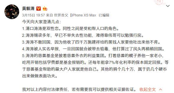 眼见不能从周立波身上占到便宜,黄毅清开始攻击周立波的老婆胡洁,长篇博文《清口揭秘》爆料的尺度之大,都无法引用,只能放上截图一观。