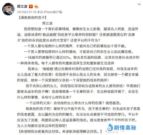 周立波已经在呼吁网络监管对黄毅清之流进行清理,无底限这方面,周立波是无法和黄毅清相比的,看来确实是被撕爆了,“ 我很想知道一个靠扒前妻绯闻,暴晒亲生女儿影像,碰瓷名人明星,造谣传谣、诋毁诽谤的‘极品娘棍’到底是平台豢养的招财猫?还是被道德遗忘的‘流量犬’他的存在到底是社会的太宽容?还是平台的不作为?”