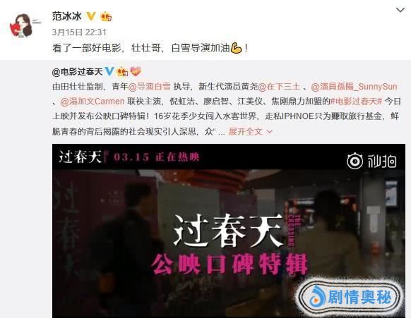 3月15日,很就没有动静的范冰冰在微博发文“看了一部好电影,壮壮哥,白雪导演加油!”这条微博得到范冰冰忠实粉丝的拥护,也让人感觉范冰冰的复出的消息并不是空穴来风。
