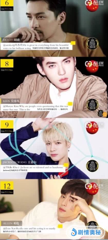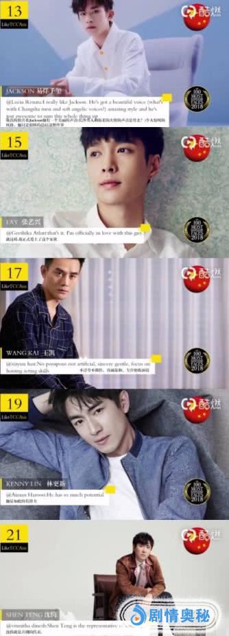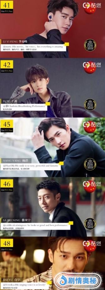 王嘉尔第9,邓论第12,张艺兴第15,不知道这三人为何能有这么高的排名?李易峰第41名,倒也中规中矩。周杰伦第50名,排名略嫌低了。