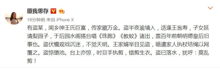 ——热播剧《东宫》因预告中曾出现过的多处名场面“失踪”,引发粉丝集体声讨,#东宫删减剧情# 也被刷上热搜。3月15日,《东宫》原著作者匪我思存更新微博,也用一个看似无关的盗贼看戏小故事,表达了自己的抗议。