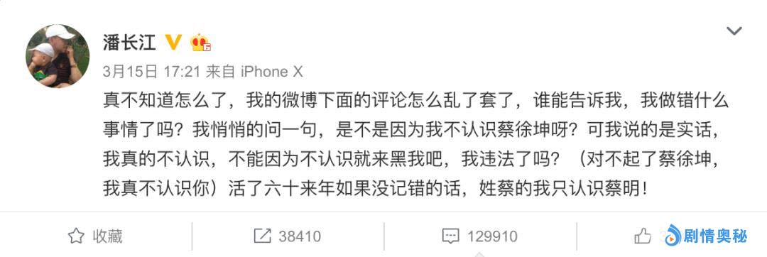 ——潘长江参加某综艺节目,做游戏时,看到蔡徐坤照片错认成了其他艺人,结果微博被粉丝围攻和辱骂。3月15日,潘长江微博发文回应,表示对此现象不可理解,也很无奈。