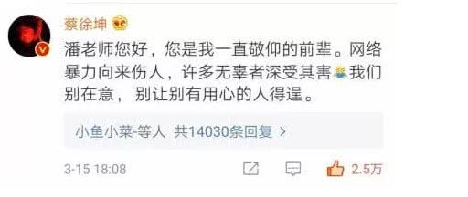 而蔡徐坤也在他的微博下面评论,表示潘长江老师一直都是自己敬仰的前辈,网络暴力向来伤人,也安慰老师,别让用心的人得逞来破坏两人的关系,这一评论也是引发了网友的热议,毕竟蔡徐坤也是只有不到20岁的年龄,身上就要背负这么多,对此不少的网友表示:那些网络语言真的是别太猖狂了!