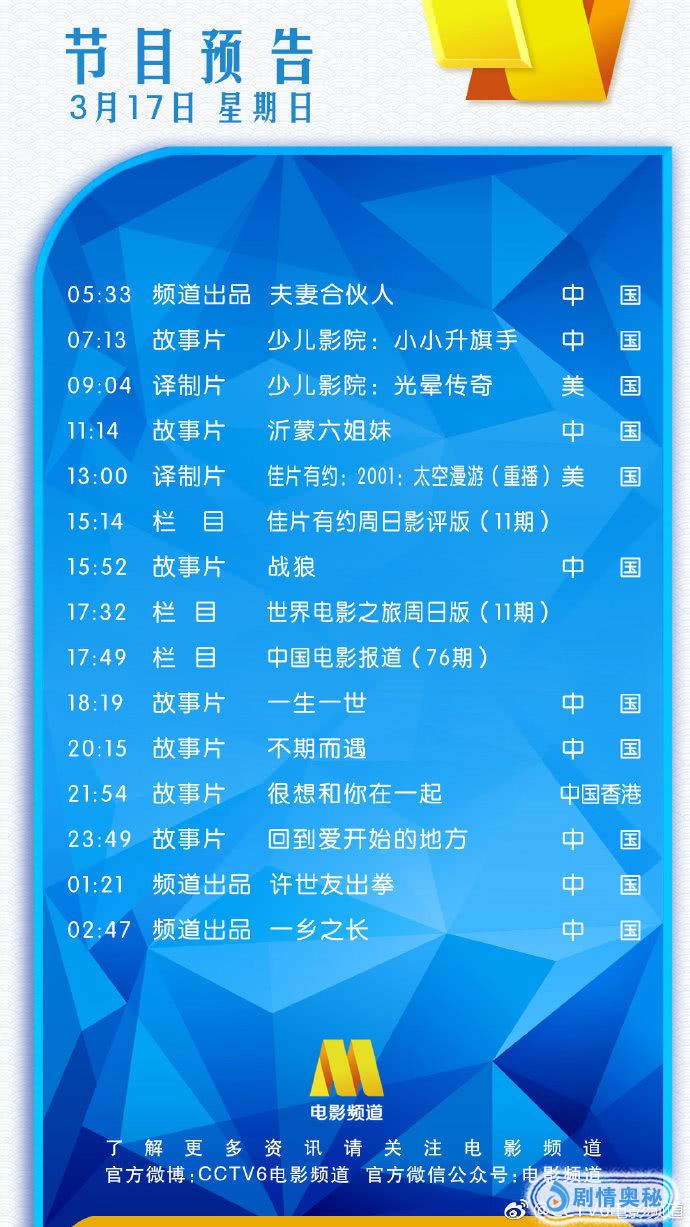 3月17日电影频道播出节目单!15:52 吴京《战狼》