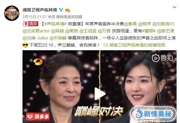 继万茜“复活”后,半决赛的阵容终于完成。刘奕君秦昊倪萍刘敏君窦骁等八位选手蓄势待发,就等下一周的狭路相逢一场比试了。一场令人血脉喷张的声音之战即将上演!为了增加刺激,节目组还邀请了几位嘉宾分别助阵。牛俊峰、刘维、娄艺潇,已是期待满满。而最让人惊讶的就是主持人董卿的出演。