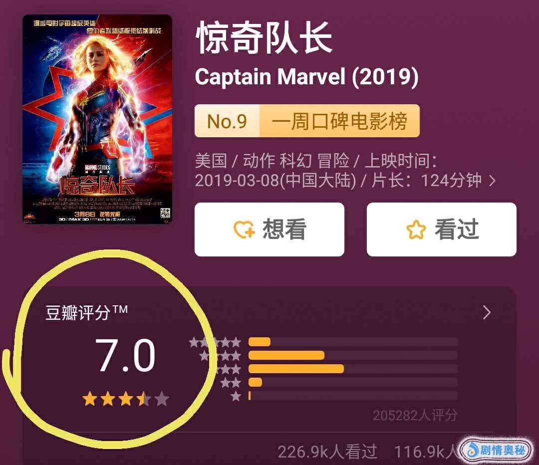 但《惊奇队长》票房飘红的背后,口碑却输了,豆瓣分数仅7.0,漫威电影罕有的低分。