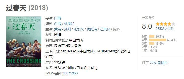 然而口碑方面,《过春天》完胜《比悲伤更悲伤的故事》,豆瓣评分高达8.0,完全称得上国产佳作,被不少媒体称为:“今年最好的华语处女作之一”