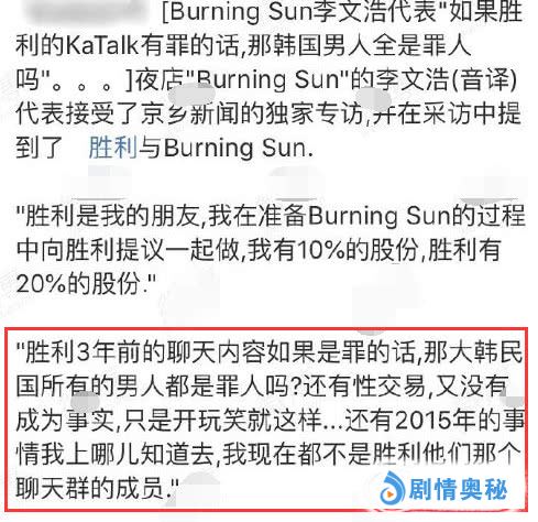 胜利夜店代表出面辩解了,完全就是替胜利洗白,对方说:如果胜利的聊天室有罪的话,那么韩国男人全是罪人!还有性交易,又没有成为事实,只是开玩笑就这样!服了,这是把所有韩国男人都拖下水了吗?