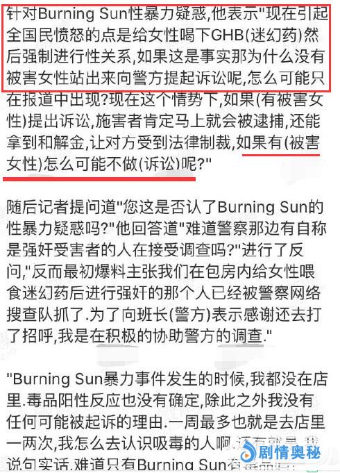 胜利的夜店代表还继续狡辩说:如果给女性喝药并强迫发生关系是事实,那为什么没有被害女性站出来向警方提起诉讼呢?怎么可能只在报道中出现呢?如果有被害女性,怎么可能不做诉讼呢?