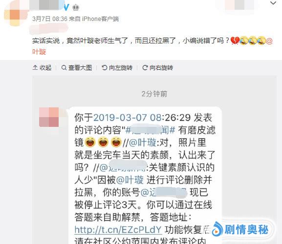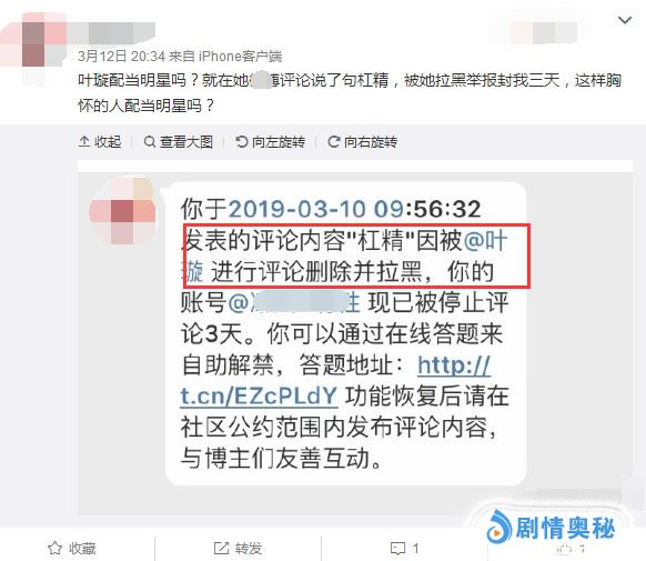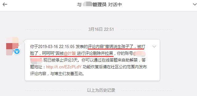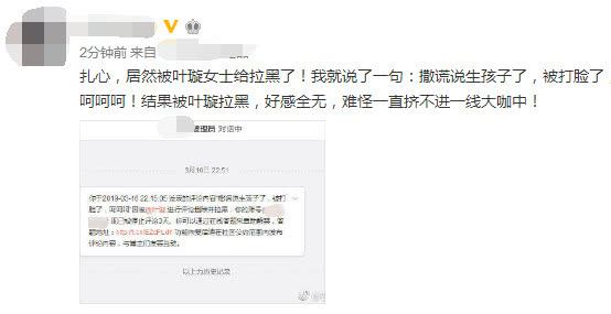 3月17号,有网友发文抱怨说:扎心,居然被叶璇女士给拉黑了,我就说了一句:撒谎说生孩子,被打脸了,呵呵!结果被叶璇拉黑,好感全无,难怪一直挤不进一线大咖中。