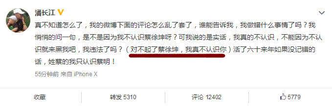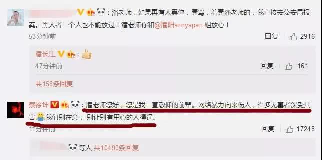 其实这事也就这么过去了,结果蔡徐坤的粉丝不依不饶了,在潘长江微博留言吐槽和谩骂,说"连蔡徐坤都不认识,你们全家也太没文化了。”然后还跑到潘长江女儿潘阳的微博下面留言谩骂。