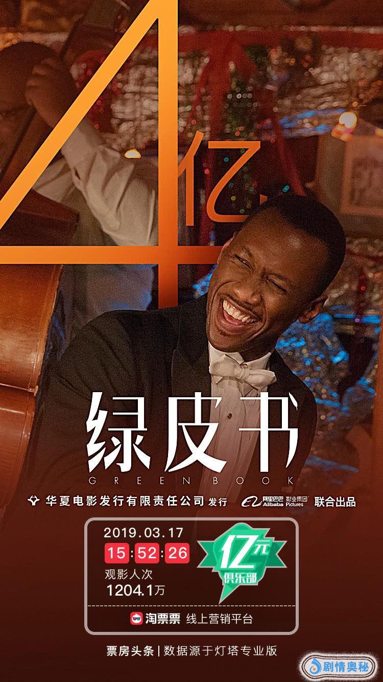据灯塔专业版数据显示,奥斯卡最佳影片《绿皮书》已于2019年3月17日15:52分突破4亿票房大关。