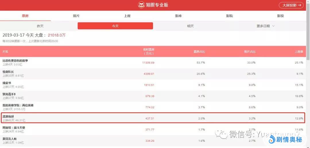 影片除了在口碑上获得影迷和业界人士一致好评之外,根据猫眼专业版实时票房数据显示,在截止发文时间,影片以上映41天,排片场次过万,上座率高达12%,以及累计总票房破46.31亿的完美数据位居日票房榜单第六位置,甚至一度超越刚刚上映的《过春天》、《阳台上》等多部新作品。