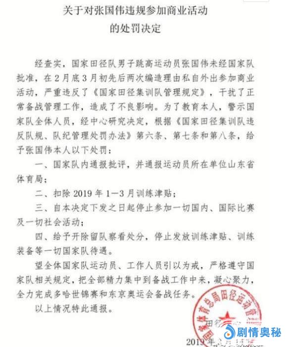 3月17日。一份这样的决定在网上被曝光,是国家体育局发出的,对张国伟违规参加商演的处罚。作为跳高一哥,张国伟在大赛在即的时候,竟然去录综艺节目。而且是未经国家队批准下发生的,违反了国家队的规定,同时影响了备战的工作进度,因此给国家队造成了不良的影响。所以处以开除出国家队作为处罚。