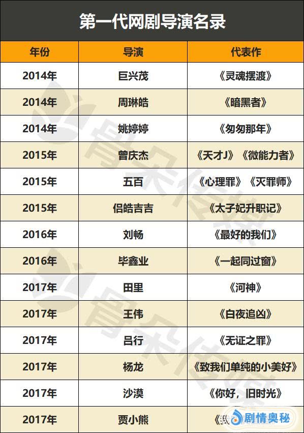 「第一代网剧导演,指跟随网剧诞生并兴盛起来的内地青年导演们,他们有的受过专业训练、从电影学院导演系毕业,有的演而优则导,从演员成功转型导演,有的从广告传媒行业而来,有的人全凭兴趣,在行业里摸爬滚打成长起来。」