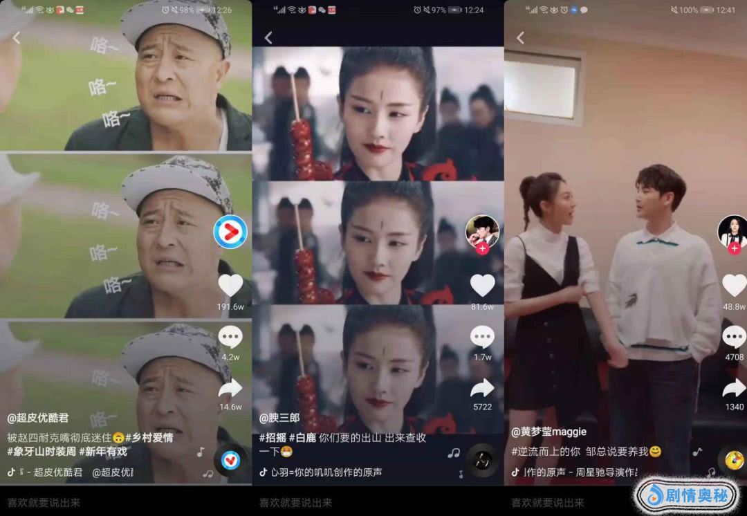 但能在抖音上大火的视频除了人物或段子耳熟能详,一般还要结合热点话题或热门抖音歌曲。比如《乡村爱情》里赵四的耐克嘴被剪成了搞笑快节奏视频,《招摇》中白鹿的镜头混剪搭配上大热的《出山》,《逆流而上的你》邹凯与高蜜的扮演者孙坚和黄梦莹,模仿《喜剧之王》“我养你啊”的经典段子,都获得了超高流量。