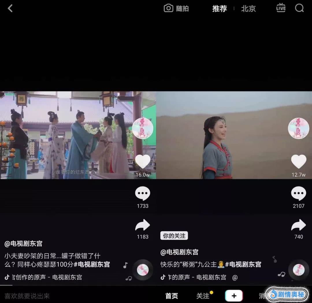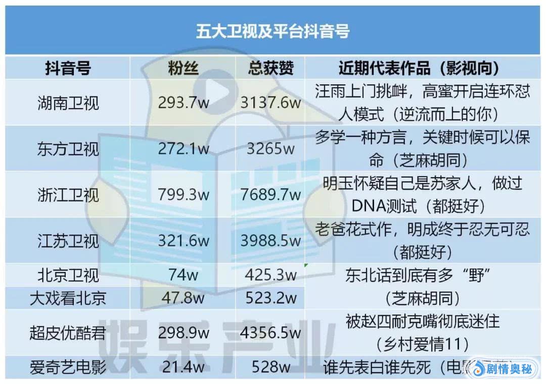 爱奇艺与腾讯视频没有专门做影视剧的抖音号,这可能是因为不少大剧都开通了自己的官方账号,比如借我一双黄金瞳、古董隆咚锵局、欢娱皓镧传等。