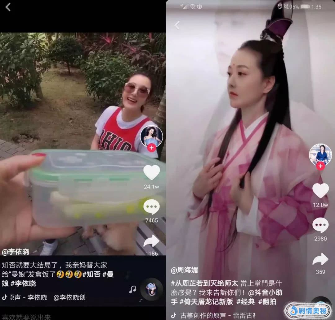有意思的是,在抖音上大火的明星视频很多并非流量咖,而是出演大剧中重要角色的演员们,比如《知否知否》中盛老太太的扮演者曹翠芬,曼娘的扮演者李依晓,新版《倚天屠龙记》中的“灭绝师太”周海媚等。