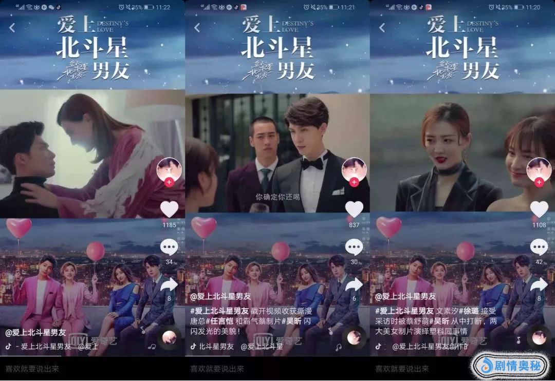 最近刚上线的《爱上北斗星男友》也早早开启了短视频营销mode,什么塑料姐妹情、漫撕男、一言不合壁咚等各种桥段都用上了,创意倒计时保持热度的想法也不错。