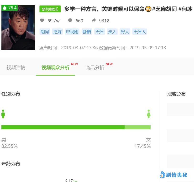 有意思的是,绝大多数影视剧女性观众明显偏多,在抖音领域同样如此,但也有少数剧目例外,比如《芝麻胡同》《倚天屠龙记》《怒晴湘西》等拥有忠实男性拥趸的作品,相关短视频用户画像也是男性占优,这说明影视短视频的传播效果还是较为精准的。