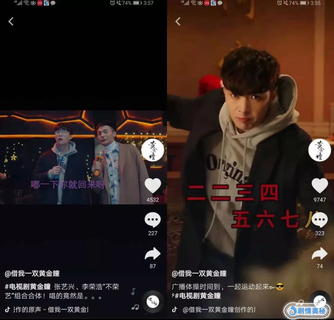 其中刚开没多久的《黄金瞳》账号君工作非常努力,把“盘他”、摆头舞、抖音广播体操等梗都充分运用在剪辑中,偶尔发一发张艺兴与王栎鑫飙歌《一千年以后》,后期加特效的前后对比这种才华向视频。