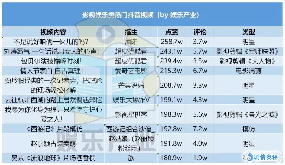 小编也整理了2019年以来在抖音上热度最高的影视娱乐类视频,明星向的、简单粗暴安利价值观取向的内容最受青睐,而且这些视频都不超过30秒。