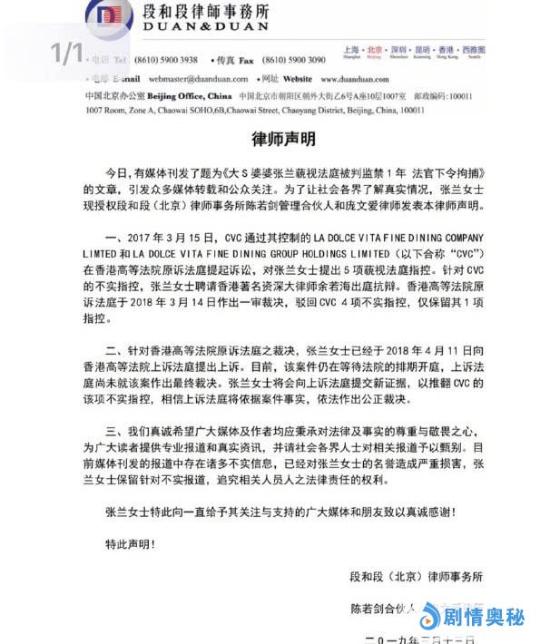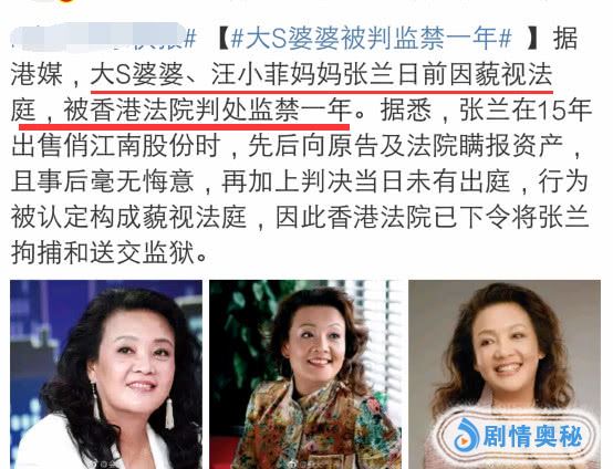 此前,有媒体报道大S婆婆、汪小菲妈妈张兰因为藐视法庭,被香港法院判处监禁一年。新闻中说要逮捕张兰,并移送到监狱服刑。不过,张兰本人发布消息辟谣了,表示要起诉港媒,汪小菲也发布了律师声明,替妈妈澄清传闻。