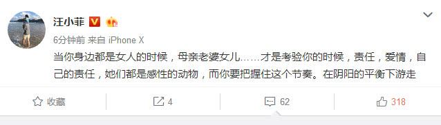3月17号晚上十点多,汪小菲更新动态,畅谈男人的责任。汪小菲说:分享给我的朋友们,男人的责任就是照顾好妈妈,疼爱老婆,教育好子女,时间的分配有限,心在就好了。但是对当有箭射过来的时候,当男人的就要第一个顶着。