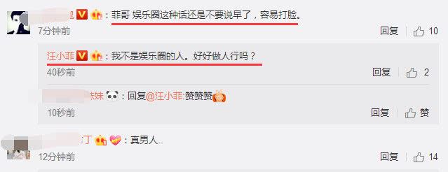 在网友夸奖汪小菲是好男人的时候,有网友讽刺留言:菲哥,娱乐圈这种话还是不要说早了,容易打脸!汪小菲也是很耿直,当场呛声网友:我不是娱乐圈的人,好好做人行吗?