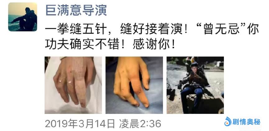 这是导演朋友圈截图,晒出来了曾舜晞受伤的照片,三根手指头包裹着创可贴,手上还有小的伤疤。另一个照片显示,曾舜晞食指受伤最严重,一共缝了5针,其它手指还有擦伤的疤痕。