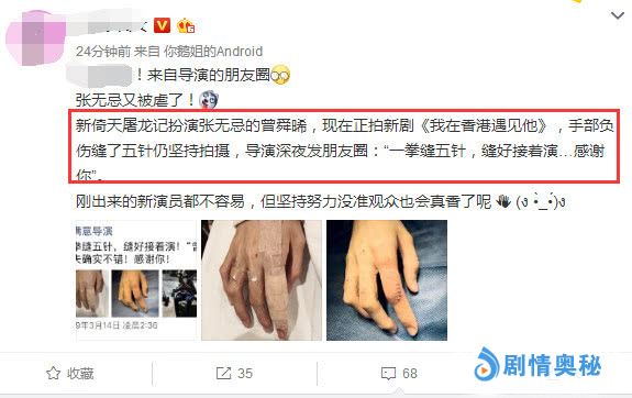 3月17号,有网友爆料说:新倚天屠龙记扮演张无忌的曾舜晞,现在正拍新剧《我在香港遇见他》,手部负伤缝了五针仍坚持拍摄,导演深夜发朋友圈:一拳缝五针,缝好接着演……感谢你!爆料者表示:刚出来的新演员都不容易,但坚持努力没准观众也会真香了。