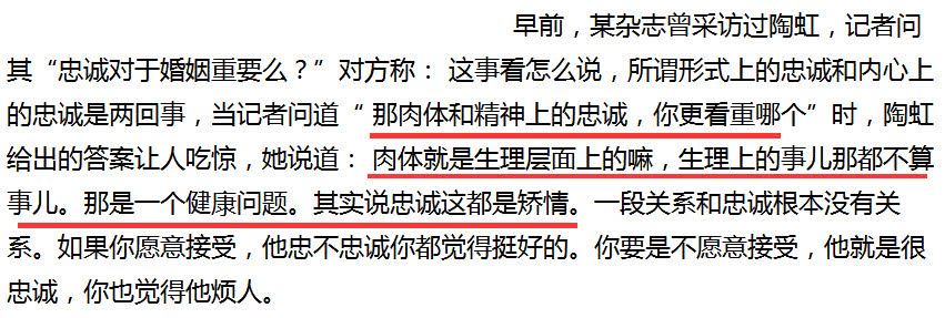 此前陶虹接受过记者采访,记者问:肉体和精神上的忠诚,你更看重哪个?陶虹当时说:肉体就是生理层面的,生理上的事都不算事,那是一个健康问题,其实说忠诚这都是矫情。陶虹指出:一段关系和忠诚根本没关系,如果你愿意接受,他忠不忠诚你都觉得挺好的。