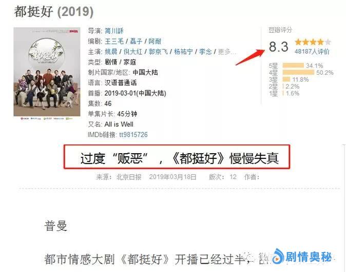 但是,在收视率直线上升趋势的同时,该剧却从豆瓣开画8.5分,下跌到了如今的8.3分,甚至还遭遇北京日报点评:过度“贩恶”《都挺好》慢慢失真。