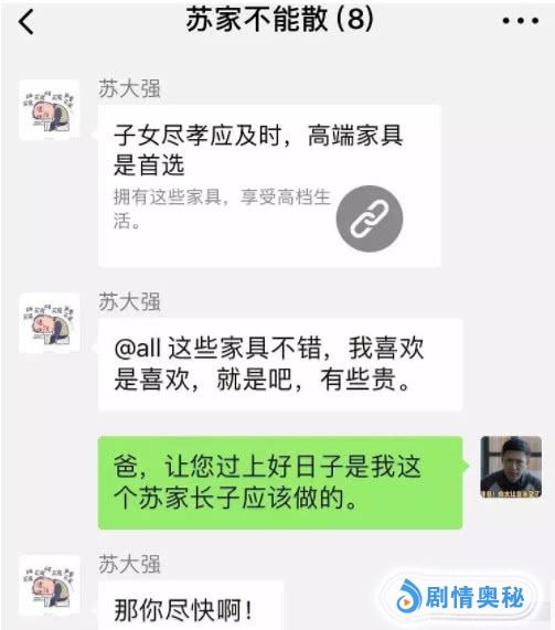子女们都要离婚了,苏大强依然一副置身事外的样子。群里发了一条链接,标题:子女尽孝要及时,高端家具是首选。这边只顾着自己的苏大强,新房住了,当然还要新家居了。这才能和自己的大三室匹配啊。你们离不离婚我管不了,家居你们得负责。