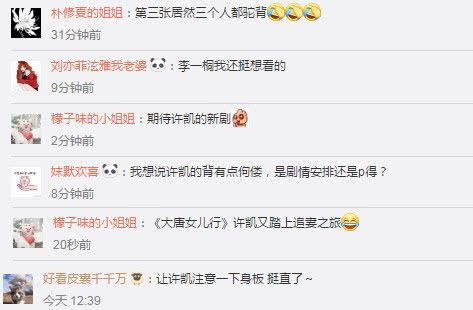 “许凯注意一下身板 挺直了~居然三个人都驼背。”有网友发现,在许凯和其他演员同框的一张剧照中,略微驼背的身形让人看得不太舒服。穿着戏服的程将军本来应该以挺拔的身姿出现在粉丝们的面前,不知道是因为剧情需要还是个人习惯,镜头里的他虽然依旧很帅气,却因为小小的驼背少了些“直”的感觉。兴许是呆的久了,就连和许凯对戏的另外两名演员都不约而同的驼背起来。三人同步节奏,画面瞧着有些许搞笑。难怪粉丝都看不下去,立马喊话程处默要挺直腰板,不要再驼背了。