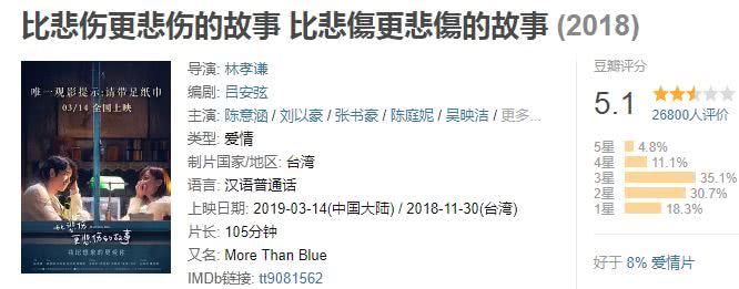 《比悲伤更悲伤的故事》由林孝谦执导,陈意涵和刘以豪等主演,翻拍自2009年韩国的同名电影。韩国版由权相宇和李宝英主演。一般情况下,翻拍片在口碑上很难超越原作,这次的台湾版也不例外。
