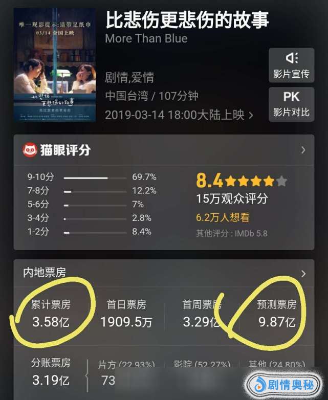 另外,我们可以得到一些启示,哪怕剧情狗血口碑不佳,这类高度煽情风格的爱情片还是挺有市场的。这会不会给今后的影视投资和创作方向提供灵感呢?