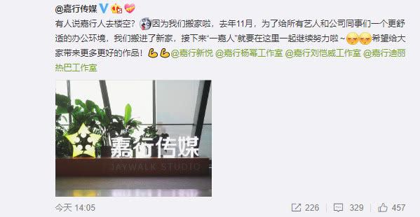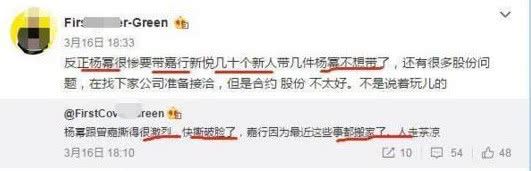 同时还有博主爆料称杨幂很惨,被公司要求要带嘉行新悦几十个新人,但杨幂不想带了,并且还有很多股份问题,杨幂和公司撕破脸,导致嘉行传媒因为这些事搬家了。这则爆料不胫而走,很快杨幂和嘉行传媒撕破脸的说法在娱乐圈扩散开来。