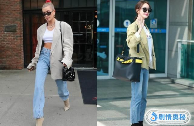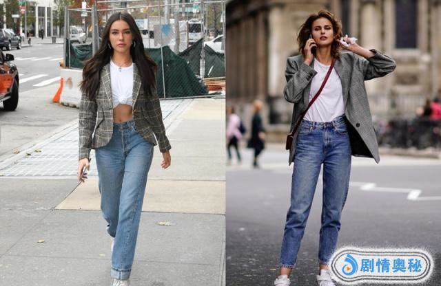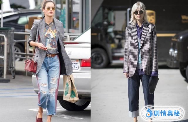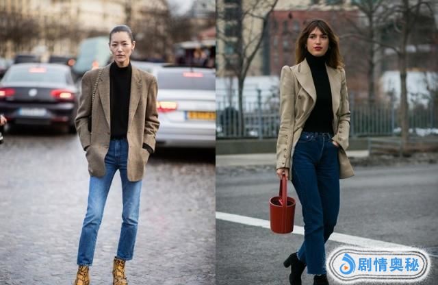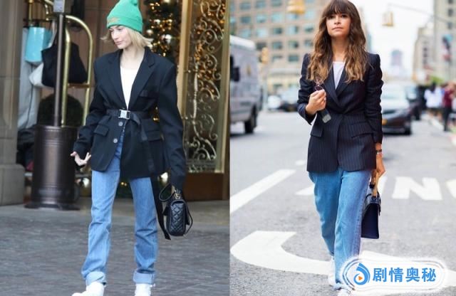 在选择西装的时候,简单的款式,黑灰色是最经常选择的,上图一中:深灰西装+白色内搭+牛仔直筒裤+白色包包+黑色短靴,白色的短靴也是推荐选择,还有就是选择包包的时候,除了简单的挎包,还有腰包也是推荐搭配。