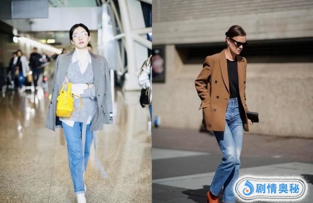 气质的穿搭,还有就是黄色调的穿搭,土黄色的西装+黑色针织内搭+蓝色牛仔裤+黑色短靴,短靴的颜色除了黑色,或者是选择暖色调,其中橘色,咖色,姜黄色都不错,简单的色调组合穿搭,包包的颜色可以选择红色调。