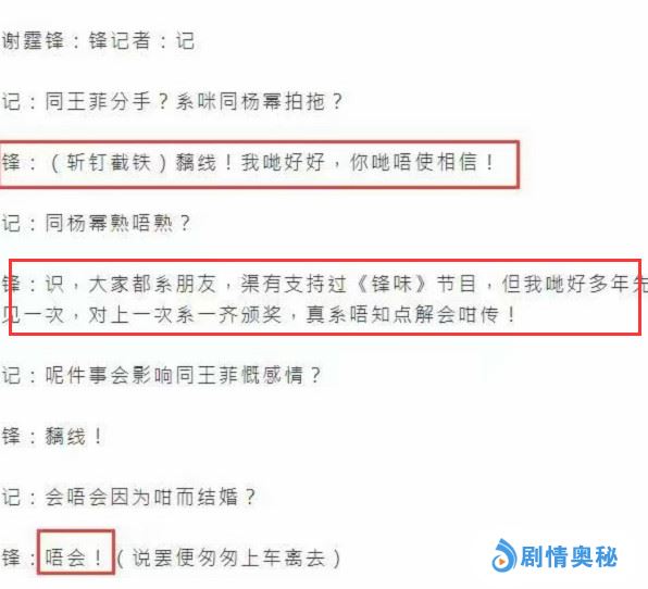 记者问他和杨幂感情时,谢霆锋也没有回避,而是大方回应说:认识,大家都是朋友,但我们许多年才见一次,对上一次是一起颁奖,真不知怎么会这么传。谢霆锋表示这个绯闻并没有影响到他和王菲的感情,可是让人不理解的是,谢霆锋承认不会和王菲结婚。换句话说,就是单纯谈恋爱在一起,不去办手续领结婚证。