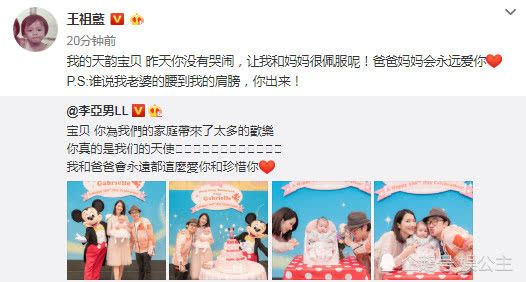 王祖蓝和李亚男结婚多年,却一直都是在过二人的世界。不料在去年的时候李亚男怀了孕,今年年初生了宝宝。初为人父人母,两个人小心翼翼又特别的惊奇。短短时间内就晒出了宝宝好几次的照片。刚刚李亚男还发微博称“宝贝,你为我们的家庭带来了太多的欢喜,你真的是我们的天使,我和爸爸永远都这么爱你和珍惜你”。王祖蓝转发也说到“我的天韵宝贝”。看来孩子的名气已经起好叫“王天韵”,很是好听呢!