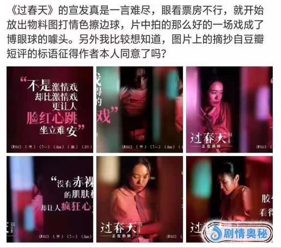 不仅如此,更有人吐槽“《过春天》的宣发真是一言难尽,眼看票房不行了,就开始放出物料打情色的擦边球,片中拍得那么好的一场戏,成了博眼球的噱头。”