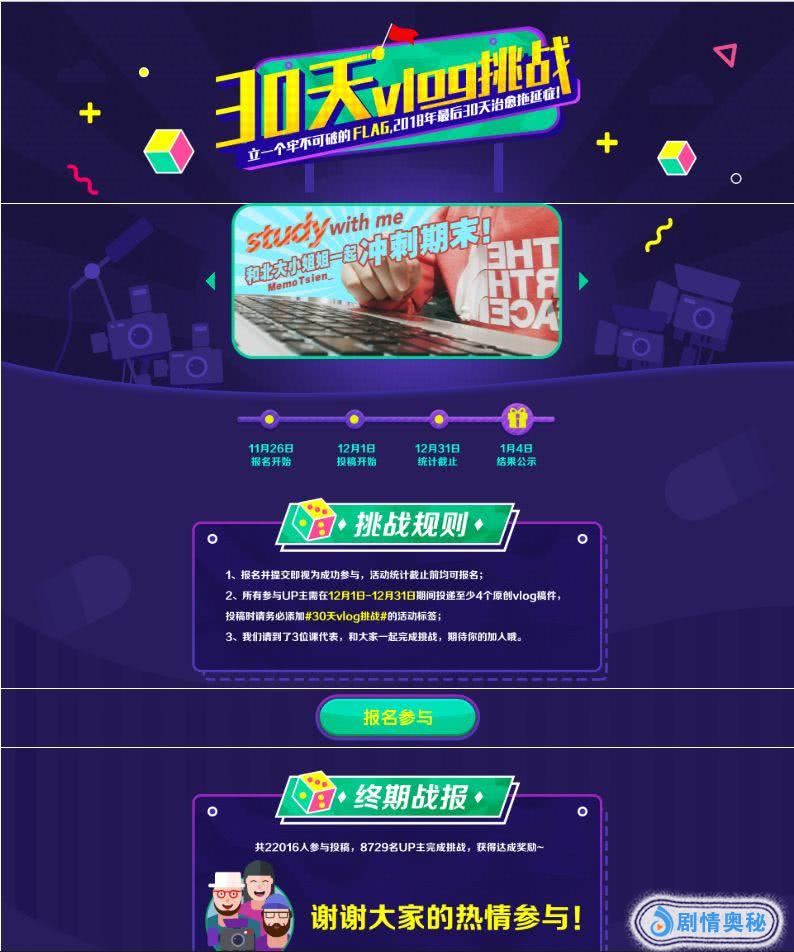 随后B站继续加码,去年12月份在首页上发起了“30天Vlog挑战”,并在首页为Vlog开设了一个和“广场”板块并立的独立分区。此外,平台还配合活动公布了一系列与vlog相关的发展构想,比如成立“创作学院”、建立vlog种子用户群与平台形成长期合作关系、举办vlog相关的线下活动。据官方数据统计,这一活动最终吸引了22016人参与,8729名UP主完成挑战。
