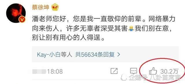 这样的说法有的粉丝看了会觉得潘老师过于直接,但比起他们直接的人身攻击,到底哪个更过分呢?后来蔡徐坤也出面回应了,说他一直以来都是很敬重潘老师的,希望有些人不要故意找事。真不愧是当红的小鲜肉,这一回应立马就收到了三十多万的点赞!