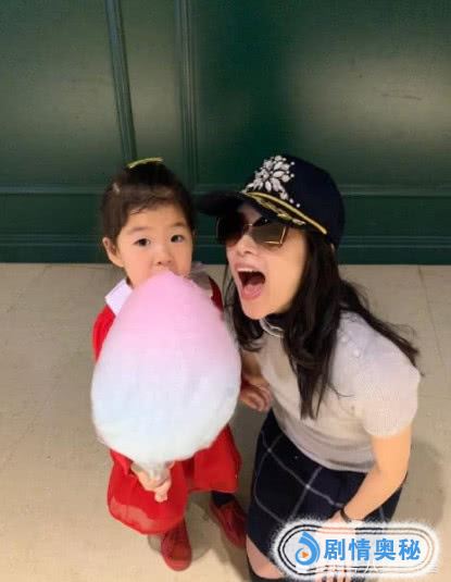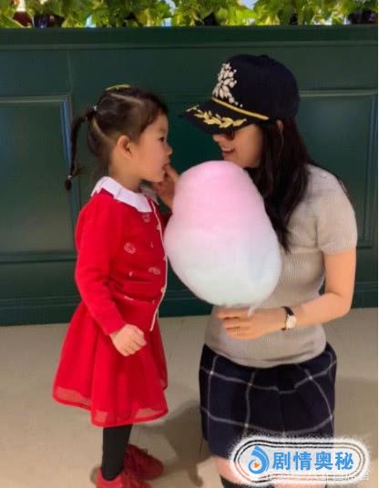 在照片当中,她扎着小辫子,身穿一身红裙子,小脚丫上也套着一双红鞋子。手里拿着一个硕大的棉花糖,棉花糖的顶端还带着一点粉色。她的妈妈跪在旁边,长大了嘴巴,好像要去吃她的棉花糖一样。当了妈之后的,她的妈妈好像越来越俏皮了,越来越接地气了一样。