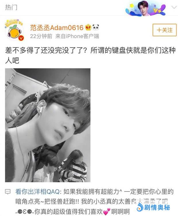 相比女星的好脾气,男明星们回应键盘侠的时候可不会这么软绵绵。范丞丞因为姐姐的原因关注度自然很高。现在他的资源在娱乐圈来说也不算太差,当然有键盘侠也盯上了他。他直接高冷的回应“差不多得了还有完没完”。