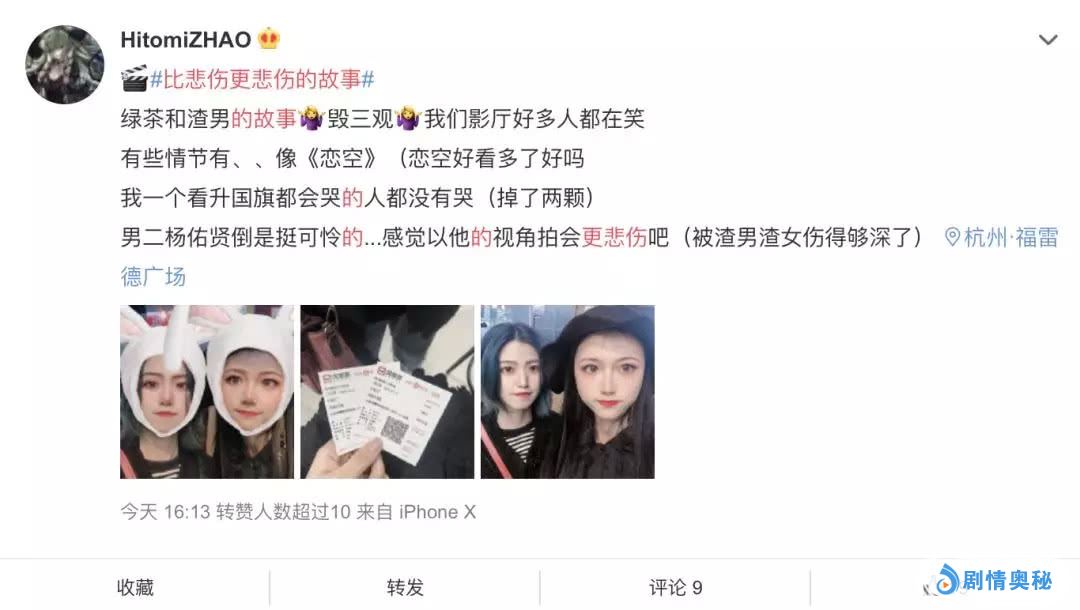 甚至该片的宣发方还另辟蹊径地展开了“反套路”营销,在抖音和微博等平台上《悲伤的故事》相关话题页中都能看到一个段子被“沙雕”网友疯狂转发: