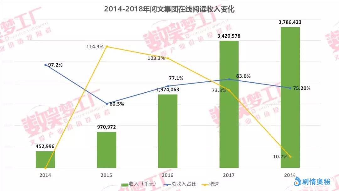 自2014-2017年,阅文集团的在线阅读收入分别为4.53亿、9.7亿、19.74亿、34.2亿,分别在总营收中占比97.2%、60.5%、77.1%、83.6%。可以说,在线阅读在阅文集团的整体收入中占据举足轻重的地位。