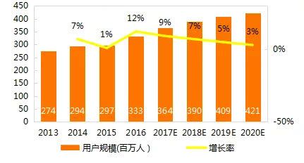 随着整体网民增速减缓和短视频等娱乐方式的崛起,网文用户增长的瓶颈已经开始出现,整体付费市场规模的增速都将处于逐年递减的状态。据Frost&Sullivan数据显示,2016年中国网络文学用户达到3.33亿人次,其中移动设备阅读的人数为3.04亿人次,占到91%,预计2020年将达到4.21亿人次,移动设备阅读的人数将达到4.09亿人次,占到97%,但增长率却将从2016年12%下降至3%。